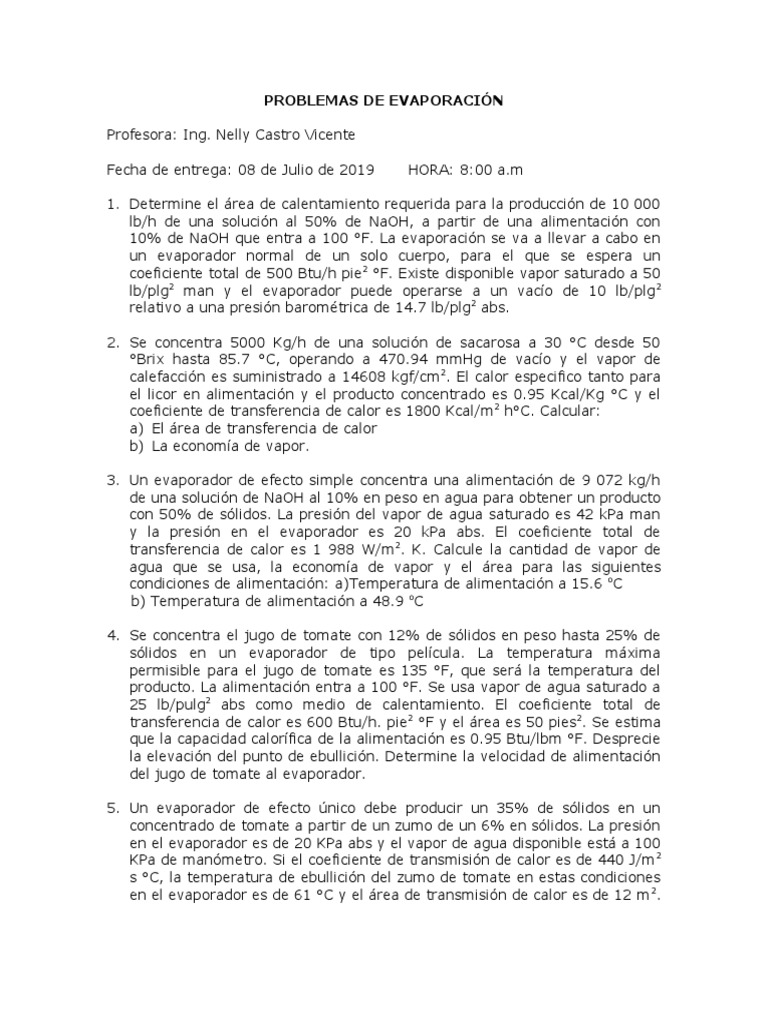 10% de NaOH que entra a 100 °F. La evaporación se va a llevar a cabo en
