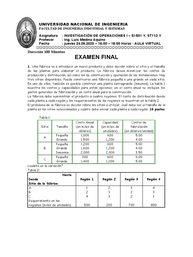 1. Una fábrica va a introducir un nuevo producto y debe decidir sobre el sitio y el tamaño