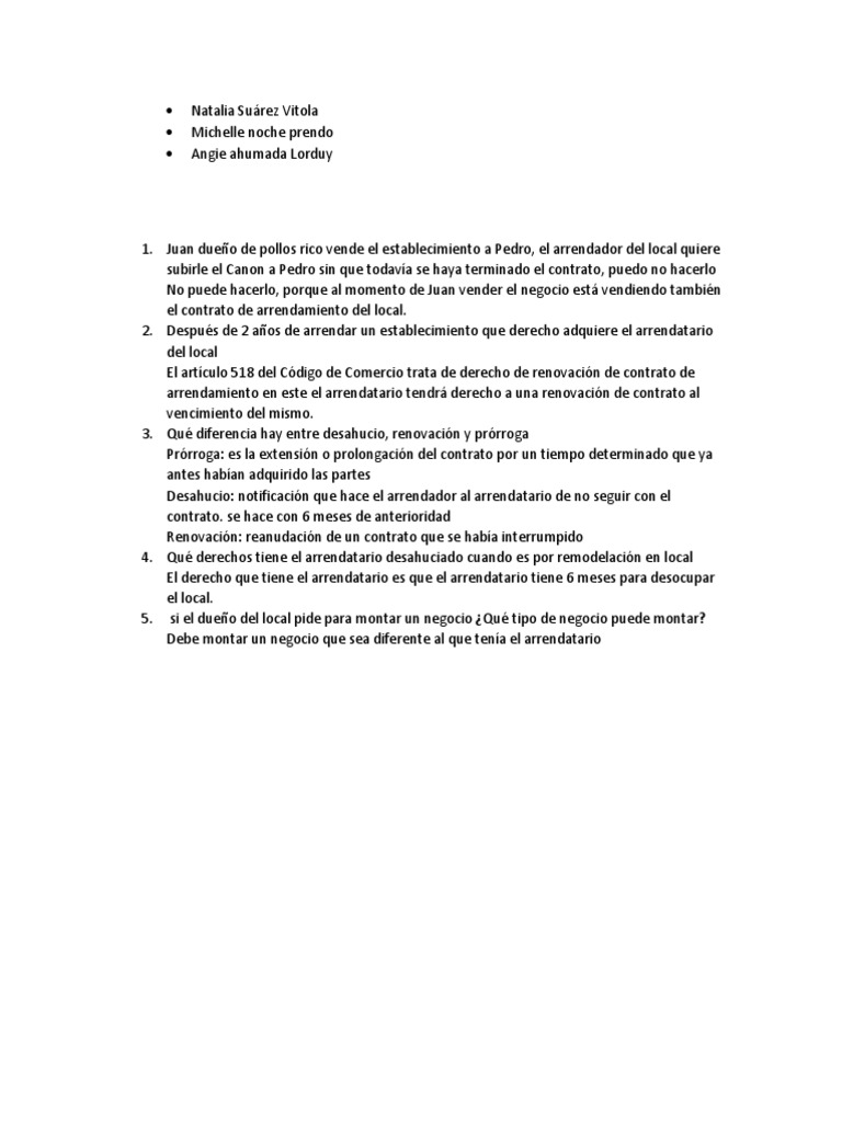1. Juan dueño de pollos rico vende el establecimiento a Pedro, el arrendador del local quiere