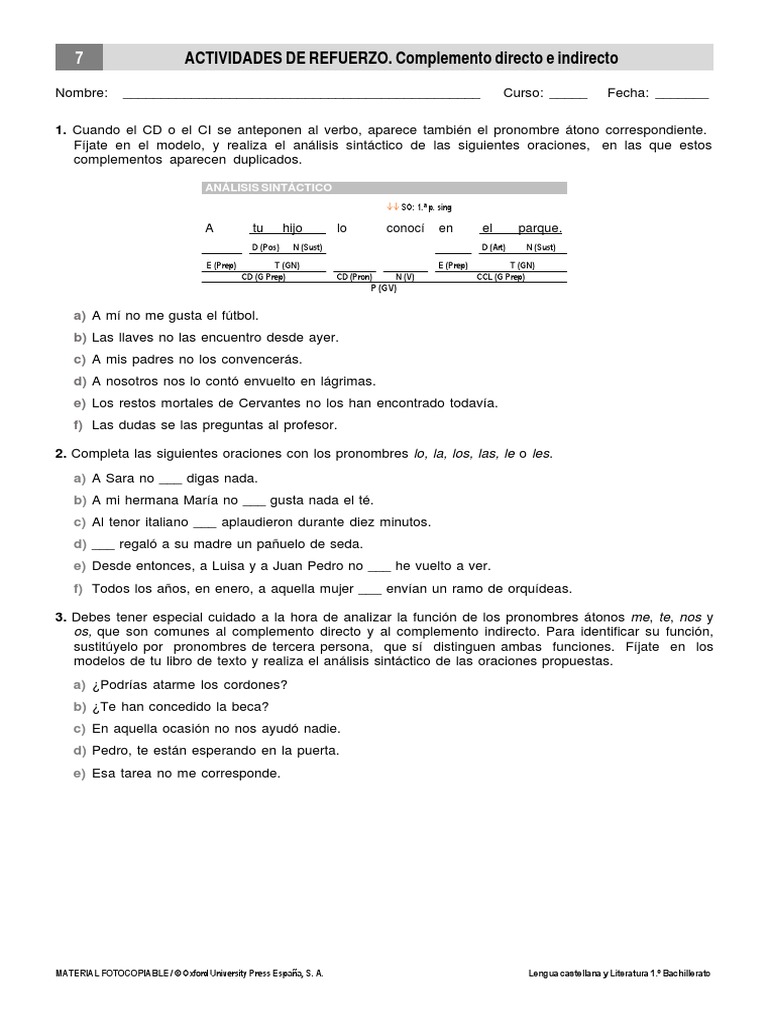 7 SOLUCIONES. ACTIVIDADES DE REFUERZO. Complemento directo e indirecto