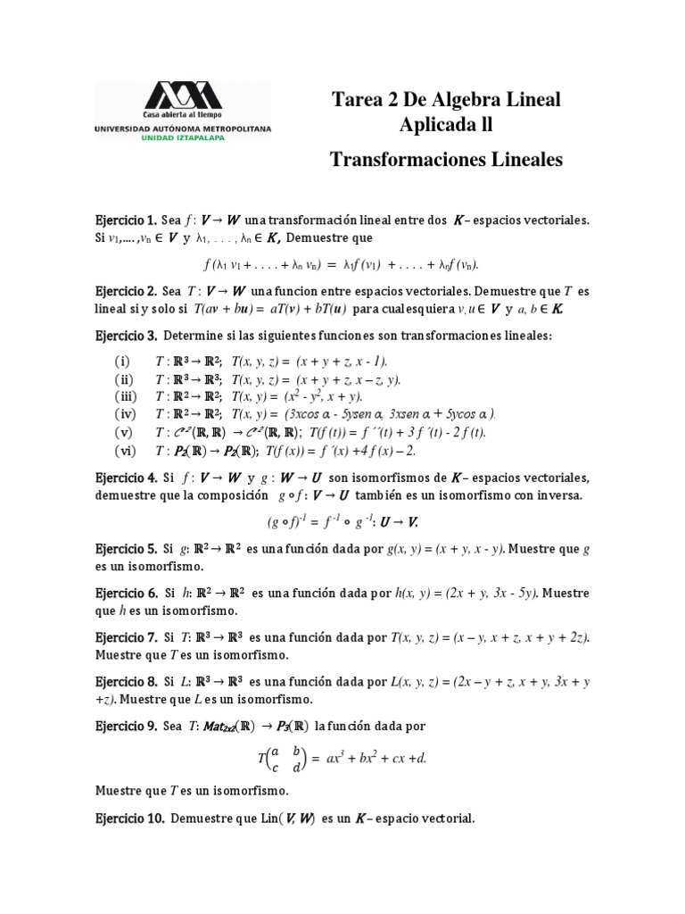 Ejercicio 3. Determine si las siguientes funciones son transformaciones lineales: