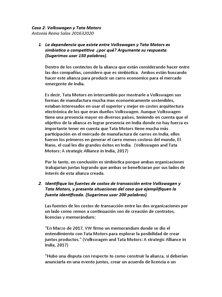 1. La dependencia que existe entre Volkswagen y Tata Motors es