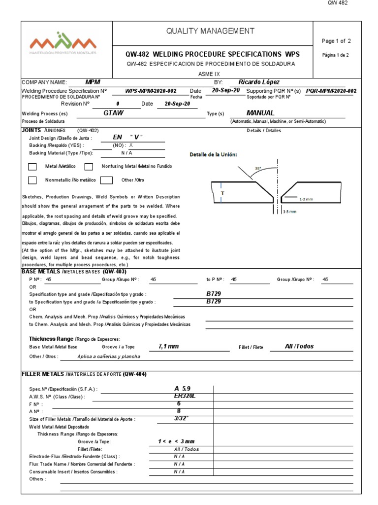 QW-482 WELDING PROCEDURE SPECIFICATIONS WPS Página 1 de 2