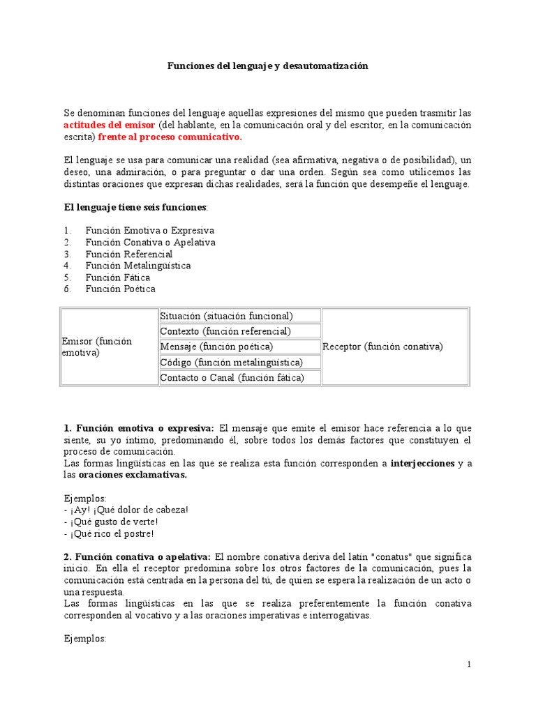 lenguaje: expresiva, apelativa y referencial. Jakobson añadía en 1921 la función estética, y