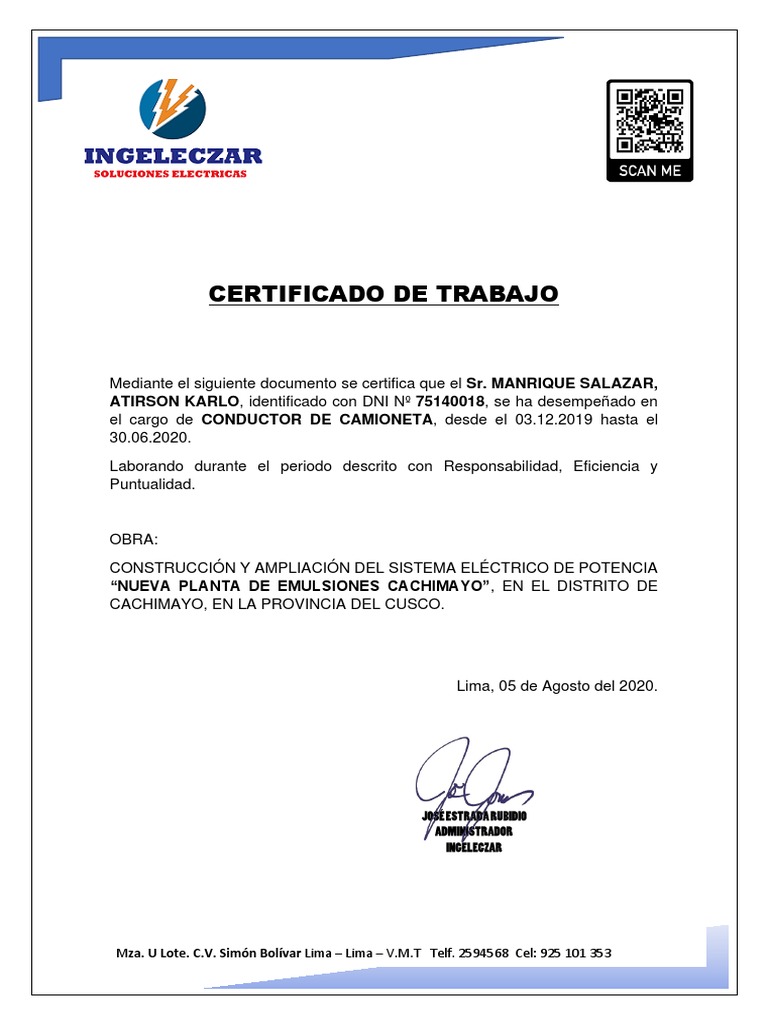 Mediante el siguiente documento se certifica que el Sr. MANRIQUE SALAZAR,
