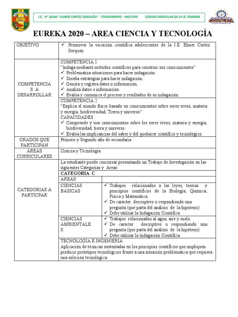 - 01) estudiante y un (01) docente asesor en todas las etapas de EUREKA Virtual 2020, y se deberán