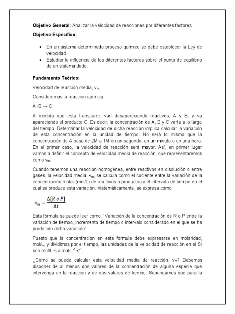 Objetivo General: Analizar la velocidad de reacciones por diferentes factores.