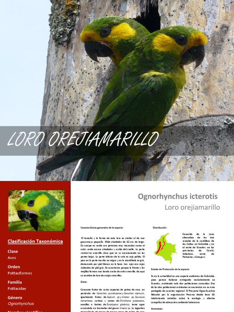 Psittaciformes su nombre de loro de orejas amarillas. Es en la actualidad es una especie endémica de Colombia,