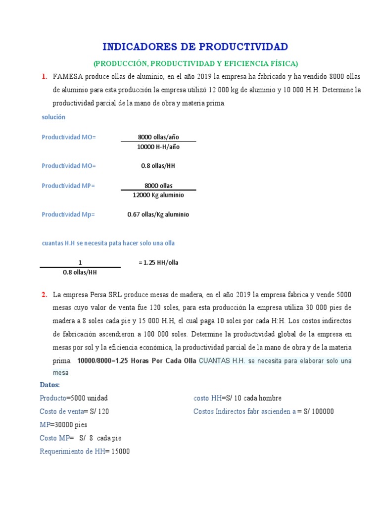 Producto=5000 unidad costo HH=S/ 10 cada hombre