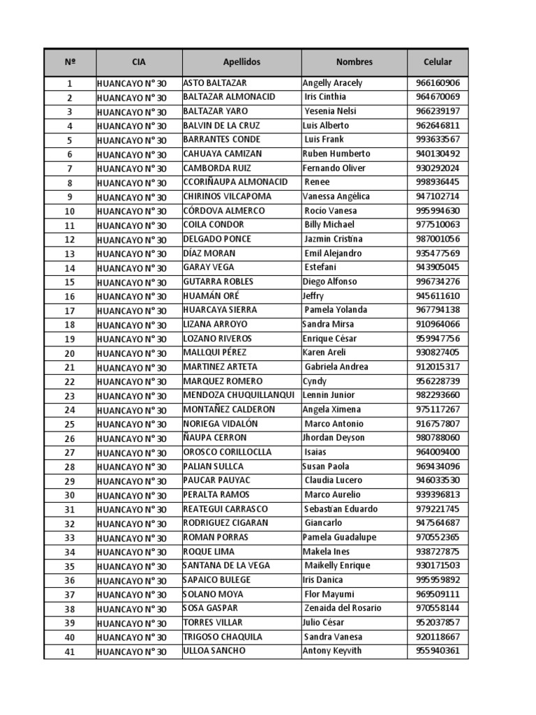 Nº CIA Apellidos Nombres Celular