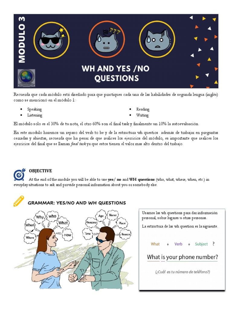 At the end of the module you will be able to use yes/ no and WH questions (who, what, where, when, etc.) in