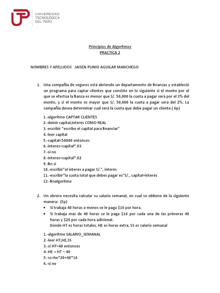 2. Un obrero necesita calcular su salario semanal, en cual se obtiene de la siguiente