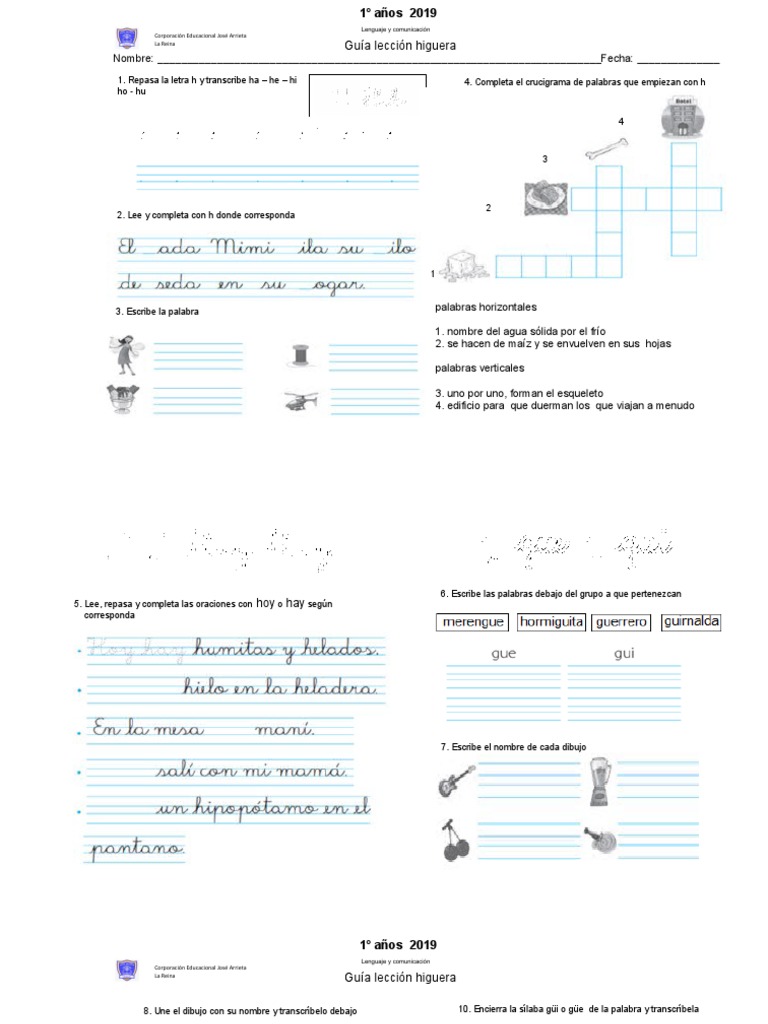 1. Repasa la letra h y transcribe ha – he – hi 4. Completa el crucigrama de palabras que empiezan con h