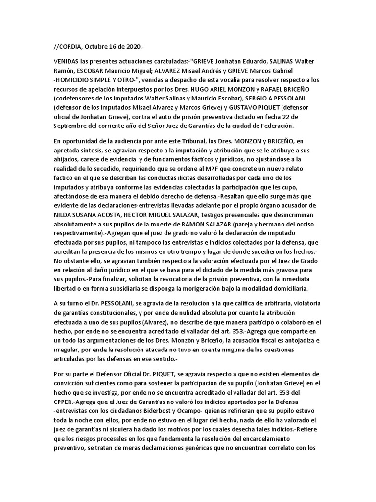 VENIDAS las presentes actuaciones caratuladas:-"GRIEVE Jonhatan Eduardo, SALINAS Walter