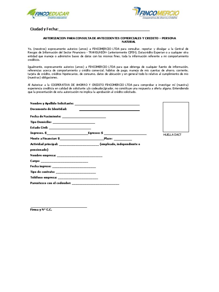 Yo, (nosotros) expresamente autorizo (amos) a FINCOMERCIO LTDA para consultar, reportar y divulgar a la Central de