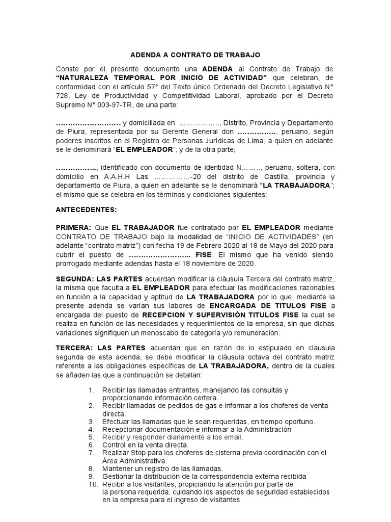 Conste por el presente documento una ADENDA al Contrato de Trabajo de