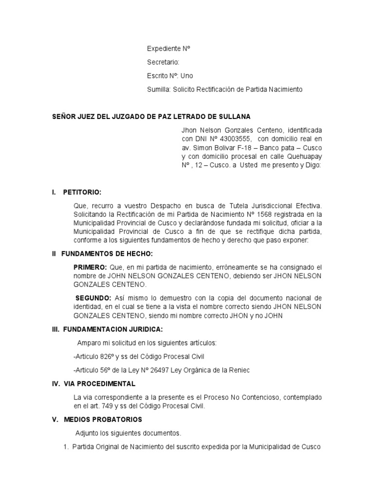 Sumilla: Solicito Rectificación de Partida Nacimiento
