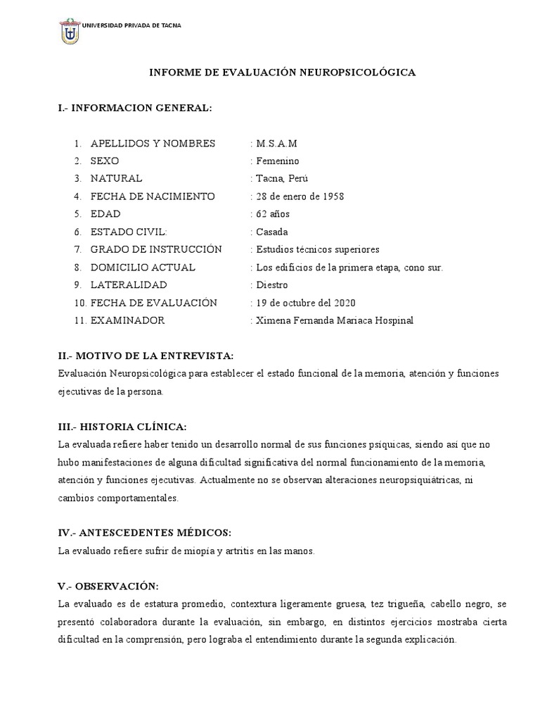 INFORME DE EVALUACIÓN NEUROPSICOLÓGICA