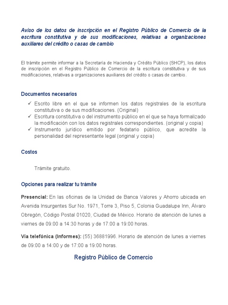 Aviso de los datos de inscripción en el Registro Público de Comercio de la