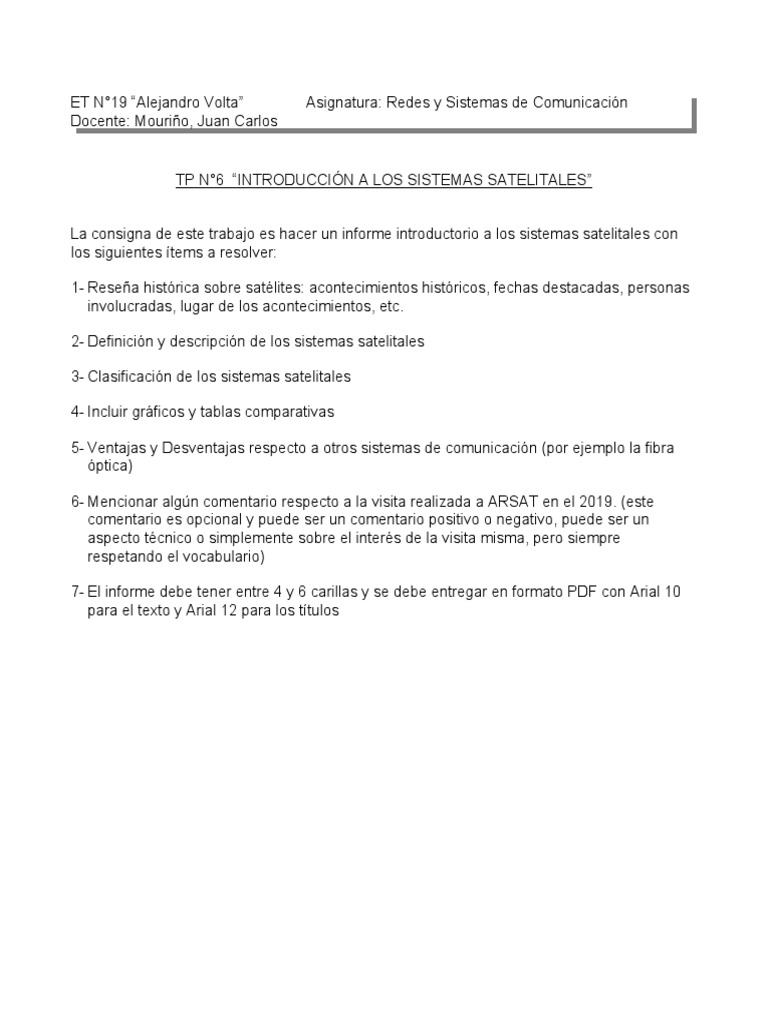 La consigna de este trabajo es hacer un informe introductorio a los sistemas satelitales con