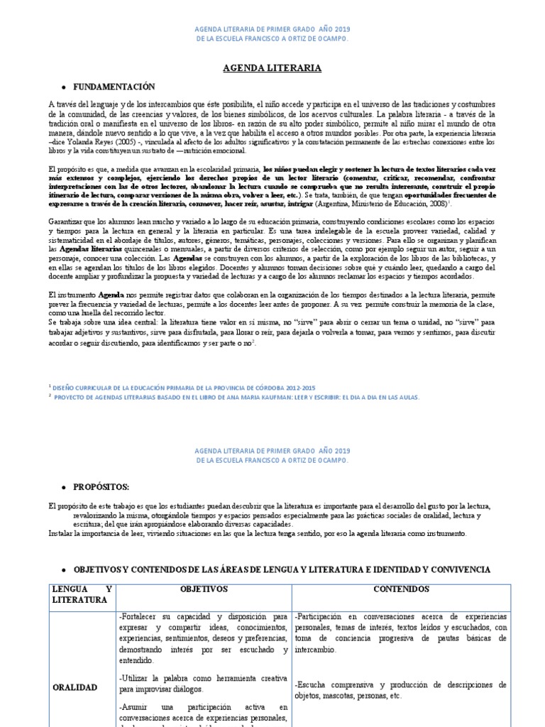 AGENDA LITERARIA DE PRIMER GRADO AÑO 2019