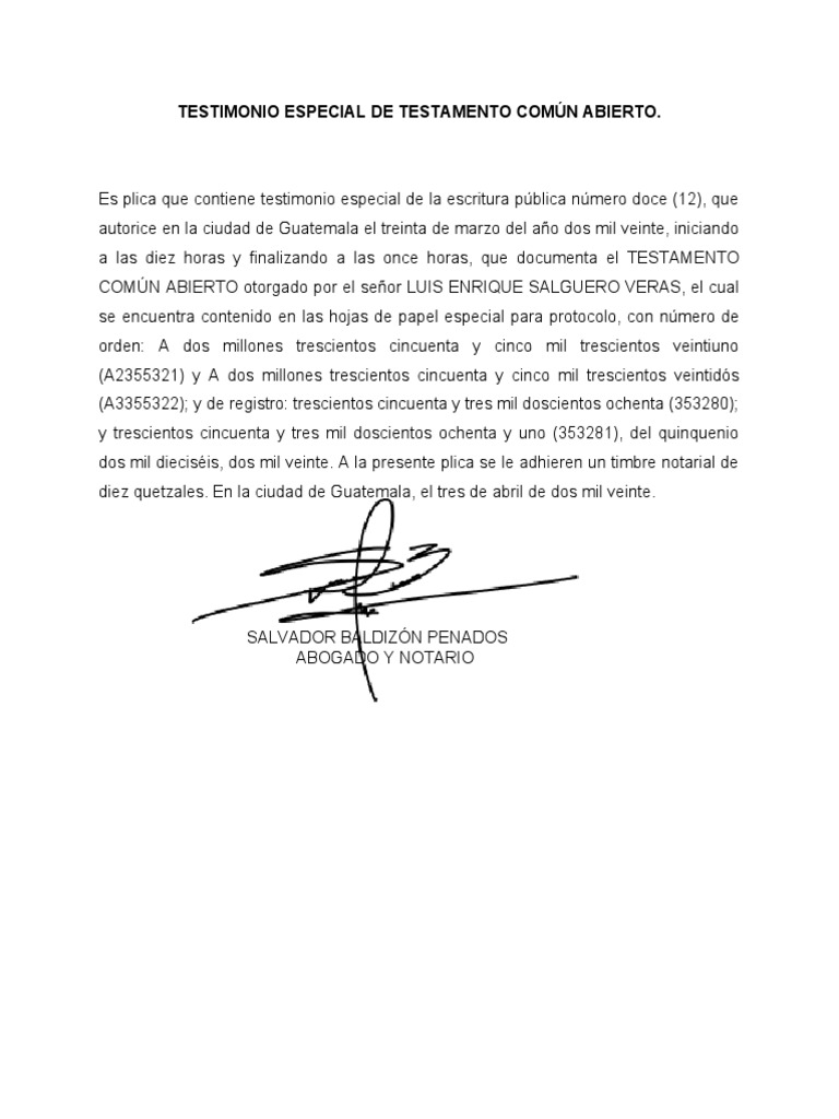 TESTIMONIO ESPECIAL DE TESTAMENTO COMÚN ABIERTO.