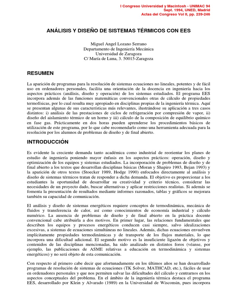 aspectos prácticos (análisis, diseño y operación) de los sistemas estudiados. El programa EES