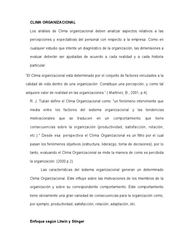 R. J. Tubán define el Clima Organizacional como: "un fenómeno interviniente que