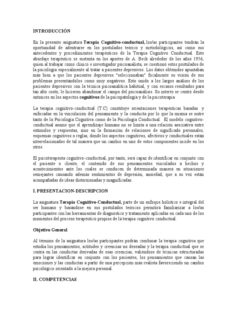 antecedentes y procedimientos terapéuticos de la Terapia Cognitivo Conductual. Este