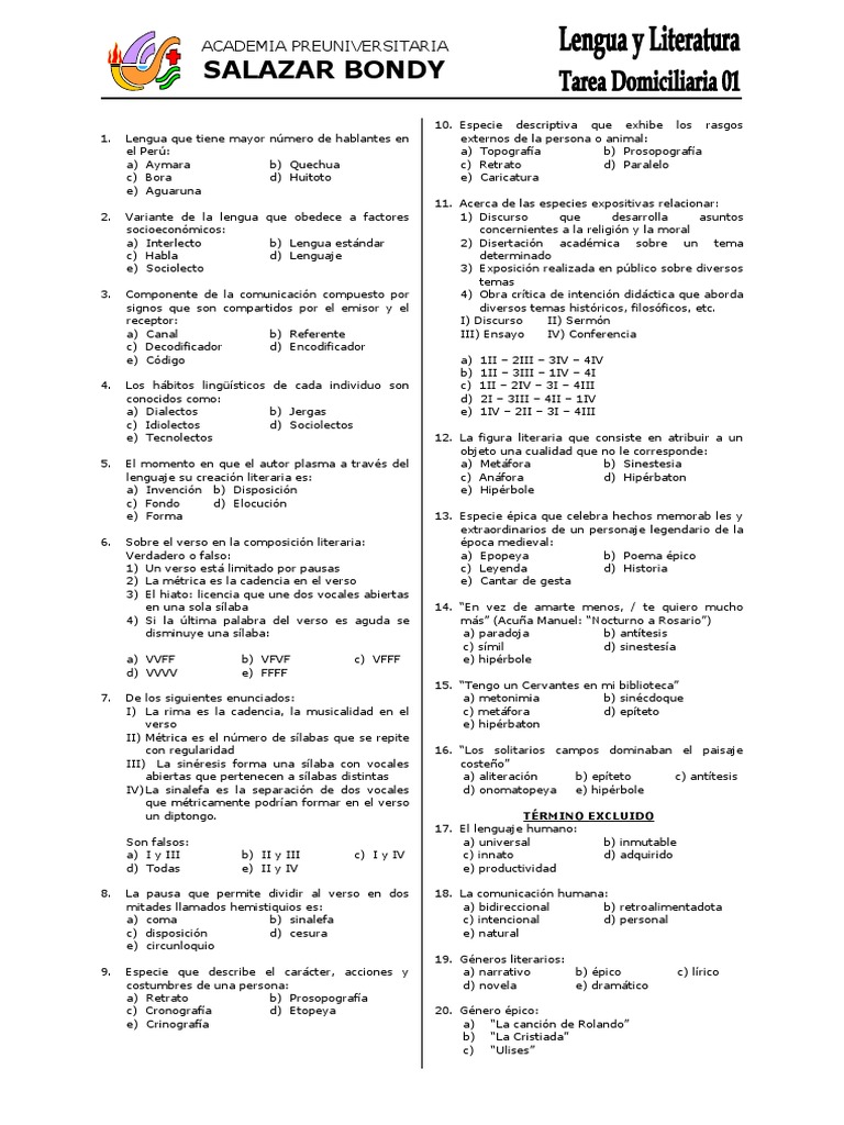 a) Aymara b) Quechua c) Retrato d) Paralelo