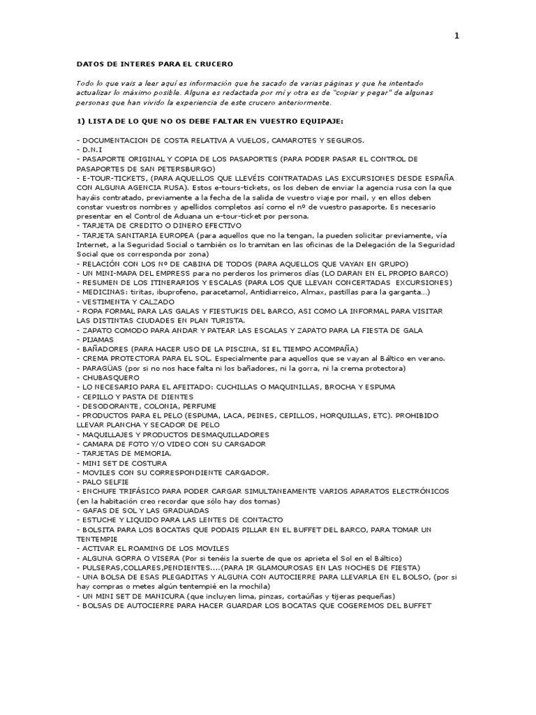 DATOS DE INTERES PARA EL CRUCERO