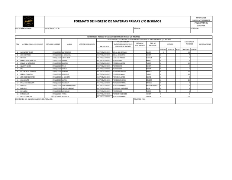 FORMATO DE INGRESO DE MATERIAS PRIMAS Y/O INSUMOS PROGRAMA DE