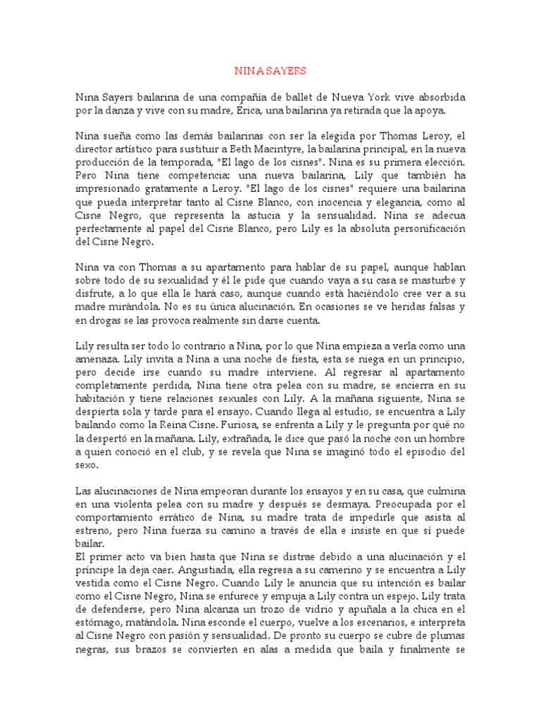 deseos de bailar. Con una personalidad muy frágil. Nina vive con su madre,