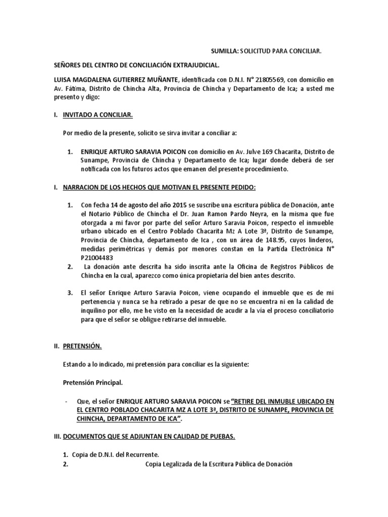 SUMILLA: SOLICITUD PARA CONCILIAR.