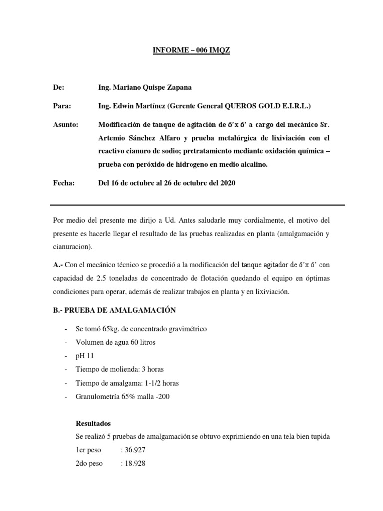 presente es hacerle llegar el resultado de las pruebas realizadas en planta (amalgamación y