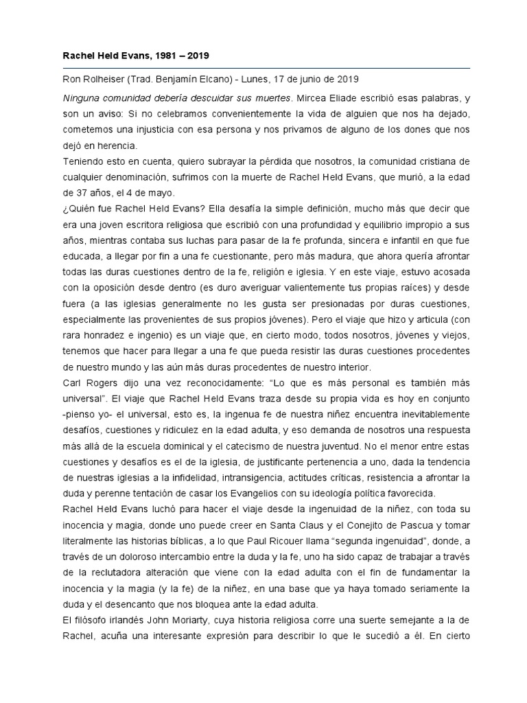 no estén muy familiarizados con Rachel Held Evans ni hayan leído sus obras. Ella escribió