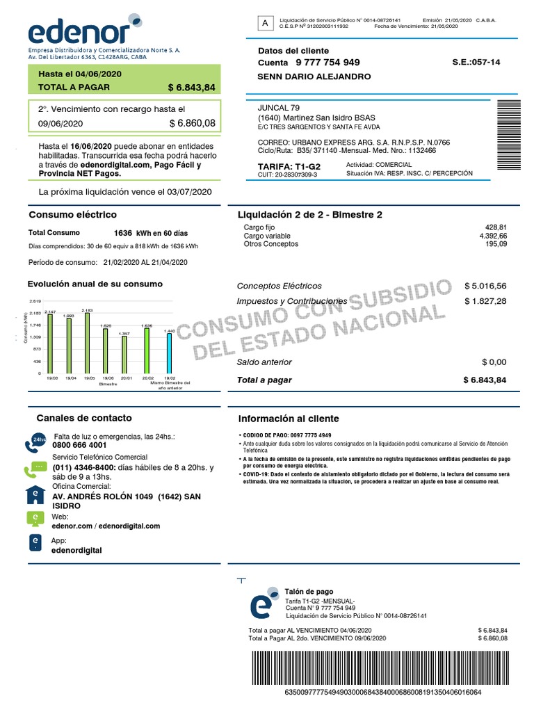 Edenor no se hace responsable por pagos realizados fuera de los medios indicados en esta factura. • Tigre Buenos Aires 732, Gral. Pacheco