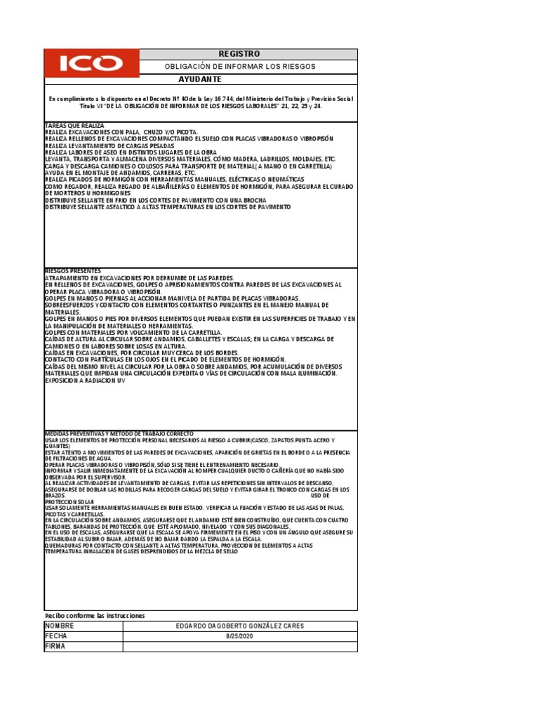 En cumplimiento a lo dispuesto en el Decreto Nº 40 de la Ley 16.744, del Ministerio del Trabajo y Previsión Social