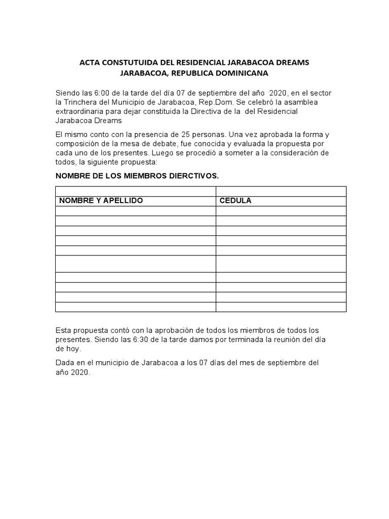 ACTA CONSTUTUIDA DEL RESIDENCIAL JARABACOA DREAMS