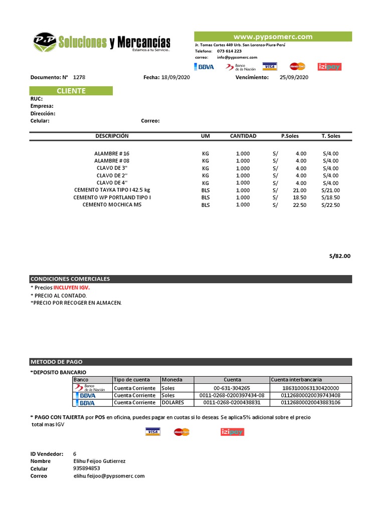 Documento: N° 1278 Fecha: 18/09/2020 Vencimiento: 25/09/2020
