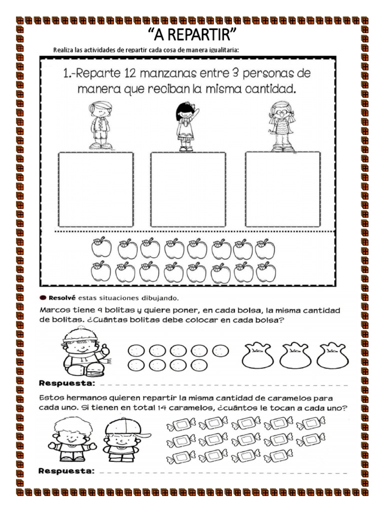 Realiza las actividades de repartir cada cosa de manera igualitaria: