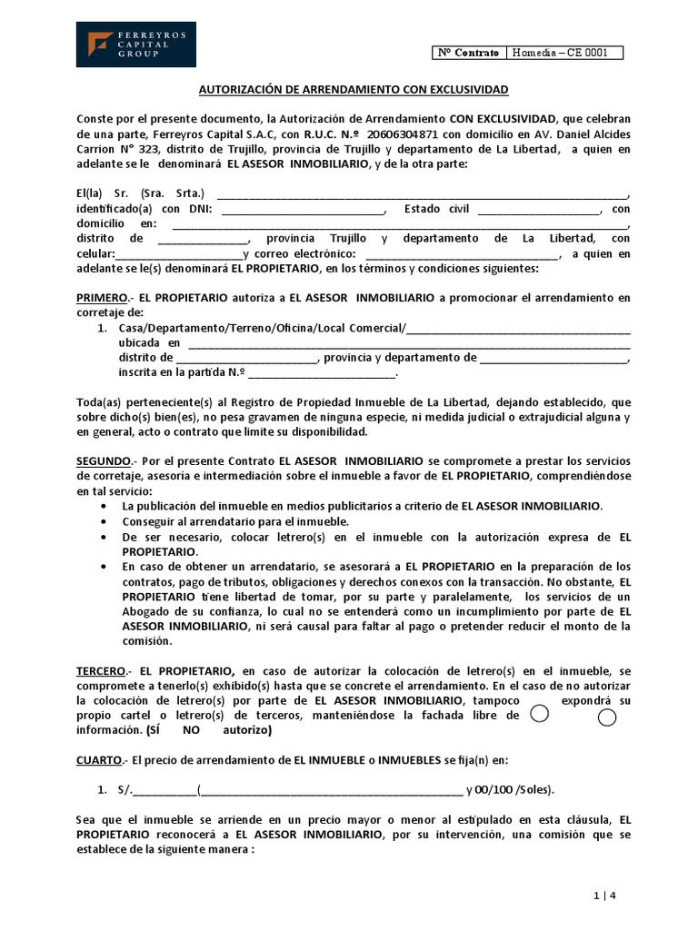 AUTORIZACIÓN DE ARRENDAMIENTO CON EXCLUSIVIDAD