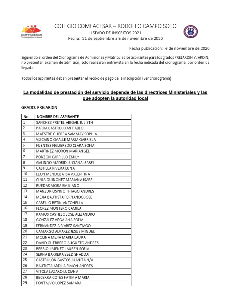 Siguiendo el orden del Cronograma de Admisiones y Matriculas los aspirantes para los grados PREJARDIN Y JARDIN,