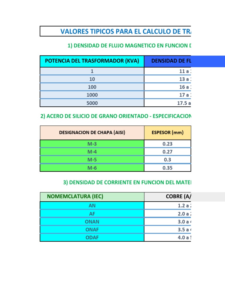 VALORES TIPICOS PARA EL CALCULO DE TRANSFORMA