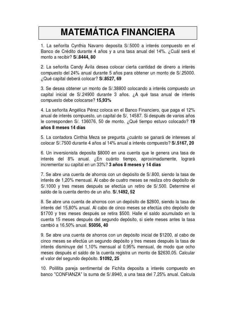 1. La señorita Cynthia Navarro deposita S/.5000 a interés compuesto en el