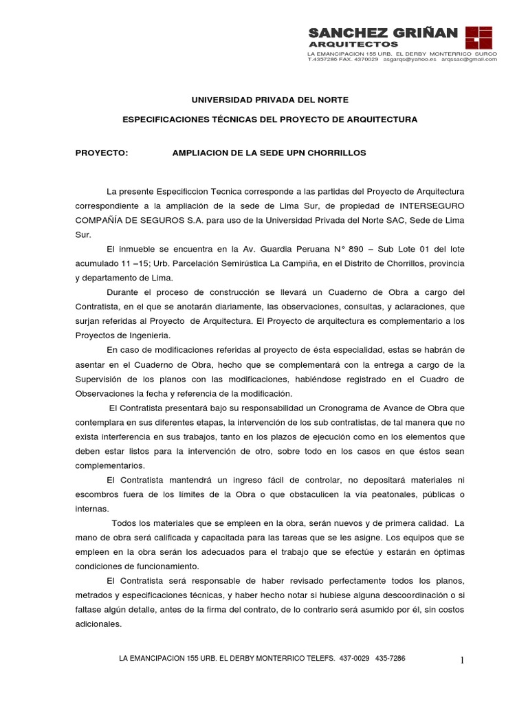 La presente Especificcion Tecnica corresponde a las partidas del Proyecto de Arquitectura