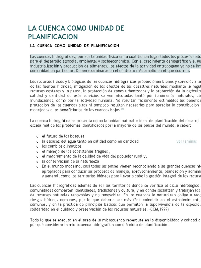 al ciclo del agua, las cuencas hidrográficas constituyen la unidad de planificación más útil para