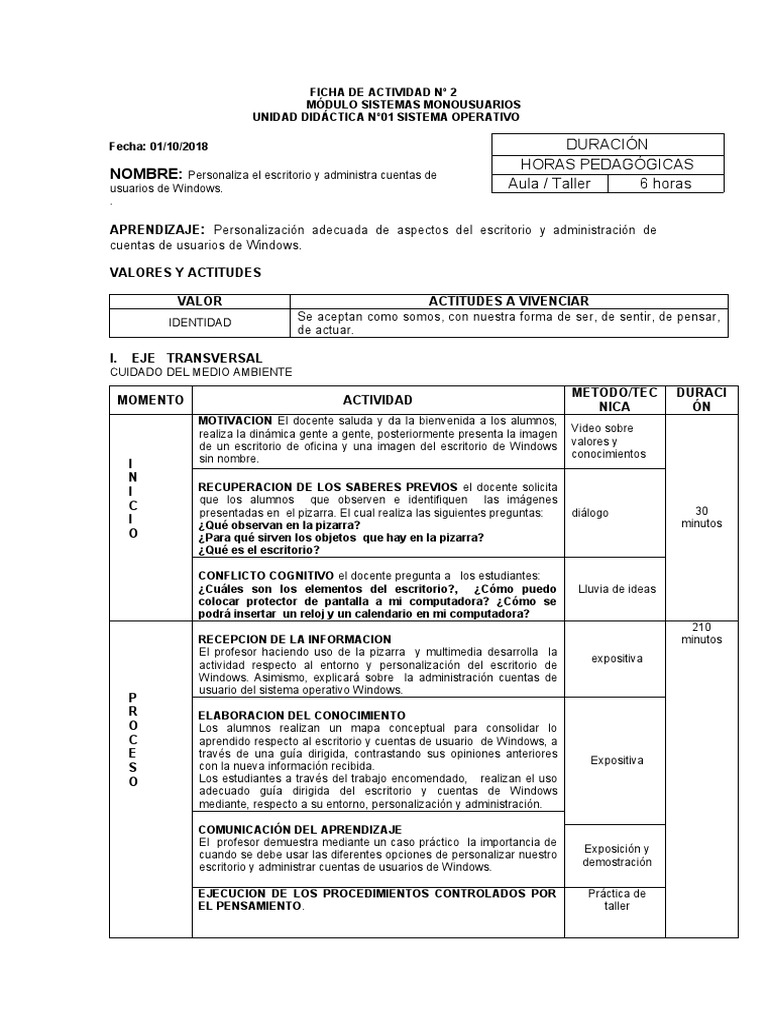actividad respecto al entorno y personalización del escritorio de