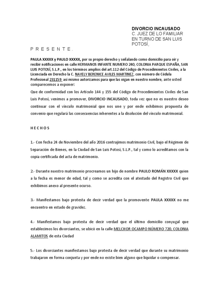 Luis Potosí, venimos a promover, DIVORCIO INCAUSADO, toda vez que no es nuestro deseo