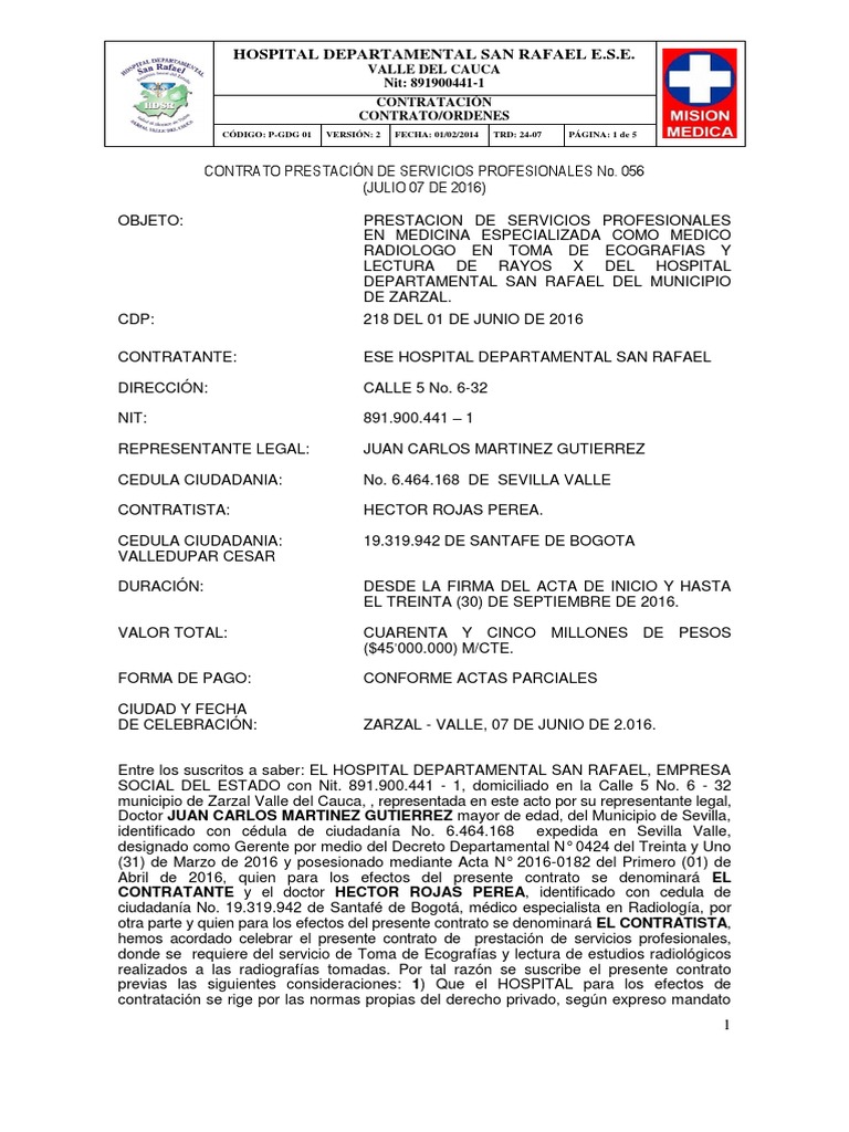 servicios profesionales, los que celebre el HOSPITAL DEPARTAMENTAL SAN RAFAEL